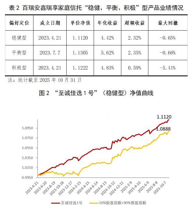 百瑞安鑫瑞享家庭信托“稳健、平衡、积极”型产品于2023年4月陆续成立,恰逢国内主要股票指数大幅振荡的市场环境。在此背景下,百瑞安鑫瑞享家庭信托在“盈利-估值”框架指导下,综合分析上市公司盈利情况,以及股市估值水平,按照既定规则管理产品权益仓位,不仅成功通过了股市大幅下跌时期的 “压力测试”,有效控制了回撤风险,还在市场反弹阶段把握了收益机会,实现了全系列产品正收益的亮眼表现。截至2025年10月31日,产品业绩统计如下: